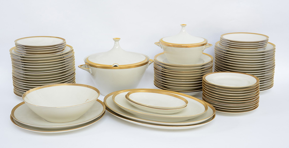 Manifattura tedesca, anni '60, servizio da tavola in porcellana color champagne con profilo dorato, composto da: trentasei piatti piani e dodici fondi, ventidue piattini, una zuppiera e una salsiera con coperchio, una insalatiera, due piatti da portata tondi e cinque ovali di dimensioni differenti (difetti)