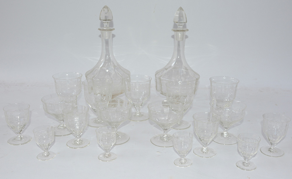 Servizio di bicchieri in cristallo, anni '60, con fascia incisa a grottesche, composto da: dodici bicchieri per l'acqua, sei da vino, dodici da spumante, nove da liquore, otto da grappa e due bottiglie con tappi (difetti)