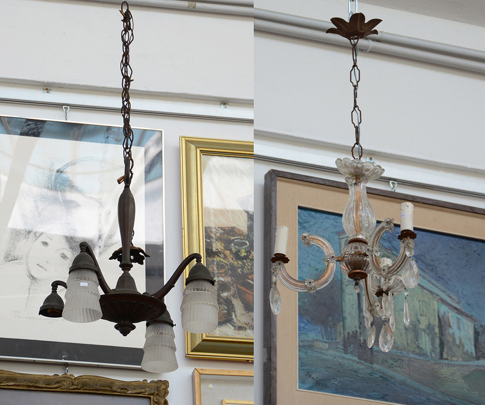 Lotto composto da un lampadarietto a quattro luci in metallo e uno a tre luci in vetro (difetti e mancanze)