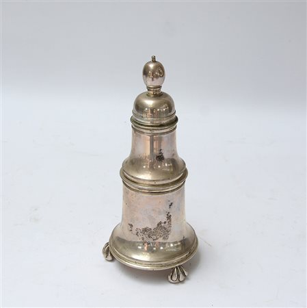 Spargitore in argento di forma conica tornita. Milano, metà sec. XX. Marcato Campisotta (h. cm 25 ca.) (gr 480 ca.) (difetti)
