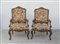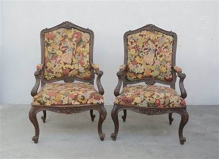 Coppia di poltrone con schienale sagomato e intagliato motivi vegetali. Braccioli e gambe mosse. Rivestite in tessuto a piccolo punto a fiori e figure femminili