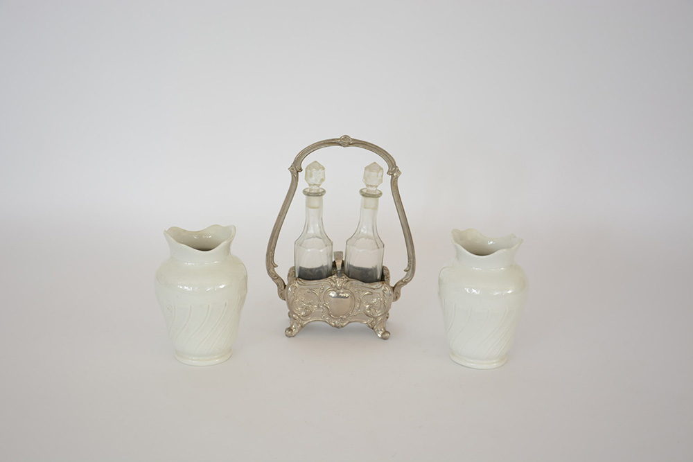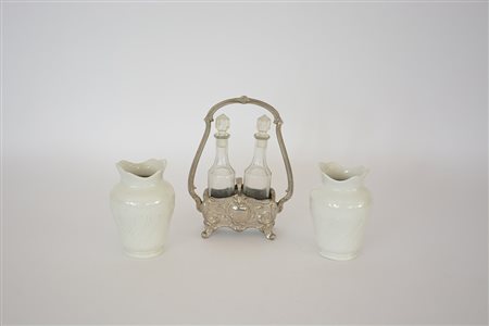 Lotto composto da un servizio da tavola in vetro e metallo e due vasi in ceramica bianca (difetti)