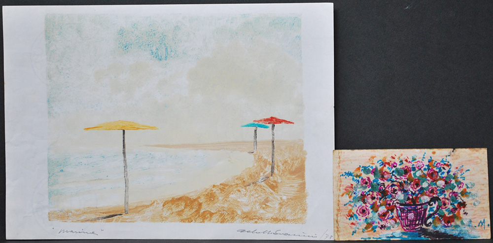 Lotto di due opere moderne raffiguranti spiaggia e vaso con fiori, misure e autori diversi