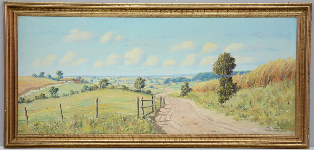 Ignoto "Campagna" olio su tela (cm 51x120) reca firma indecifrata in basso a destra, in cornice (difetti)