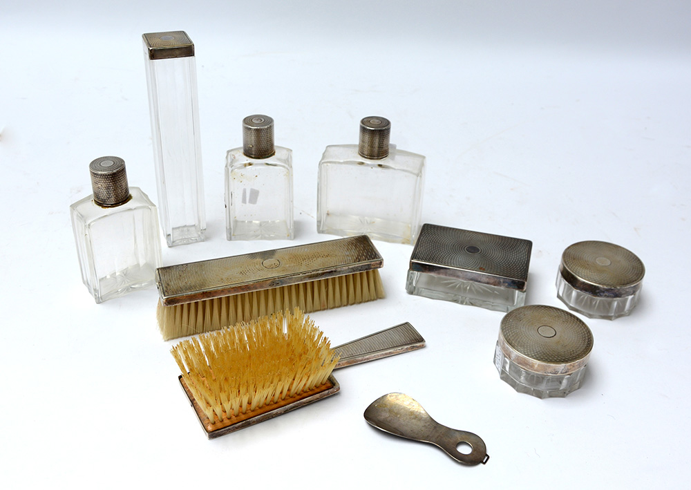 Servizio da toilette in lamina d'argento (titolo 925/1000) decorata a guillochè composto da sette contenitori in argento e vetro e due spazzole. Milano, anni 30/40, marchio del Fascio Ditta Sana e Miracoli unito ad un calzascarpe in argento (difetti e mancanze)