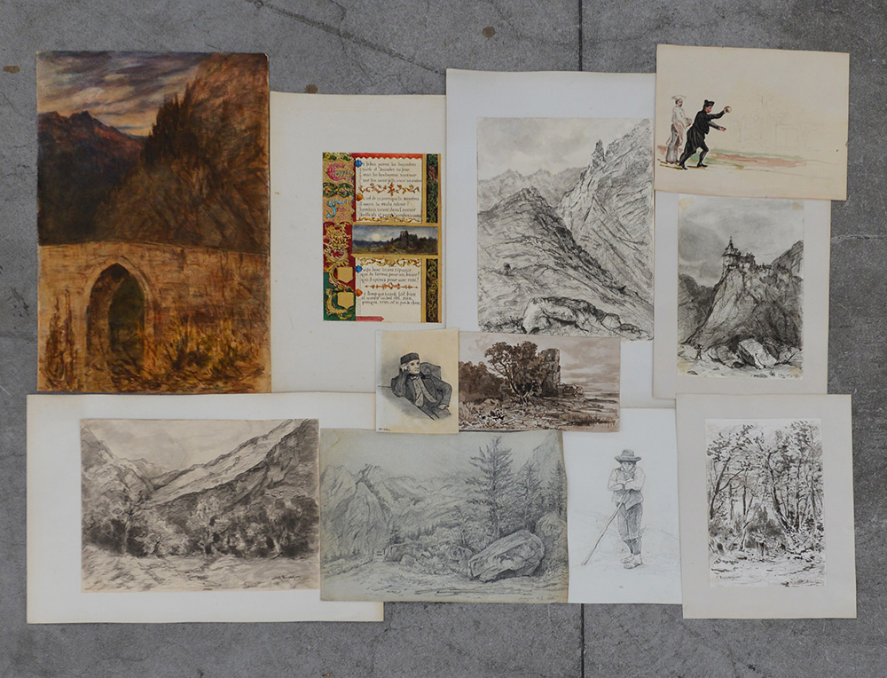 Giuseppe Puricelli Guerra (Gallarate 1832-Casirate D'Adda 1894)Cartelletta contenente undici tra disegni, bozzetti, incisioni ed acquarelli per lo più raffiguranti paesaggi, molti firmati (difetti)
