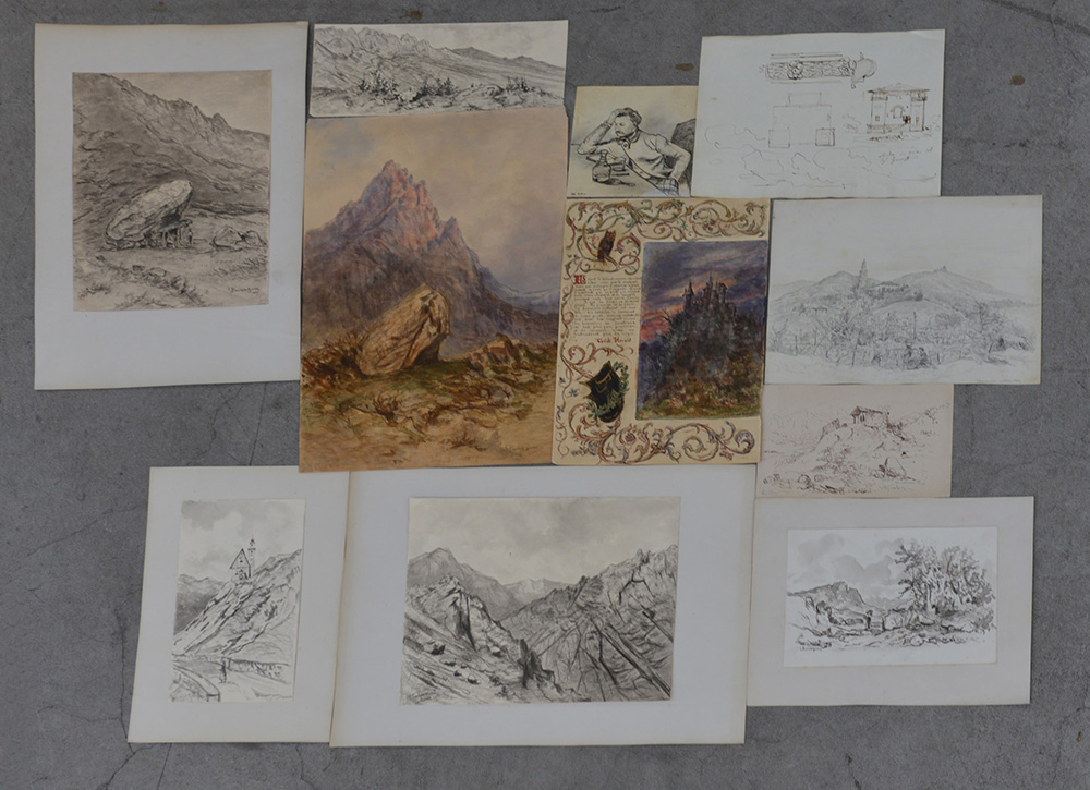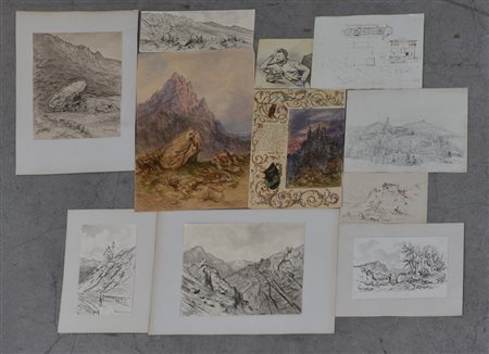 Giuseppe Puricelli Guerra (Gallarate 1832-Casirate D'Adda 1894)Cartelletta contenente undici tra disegni, bozzetti, incisioni ed acquarelli per lo più raffiguranti paesaggi, molti firmati (difetti)