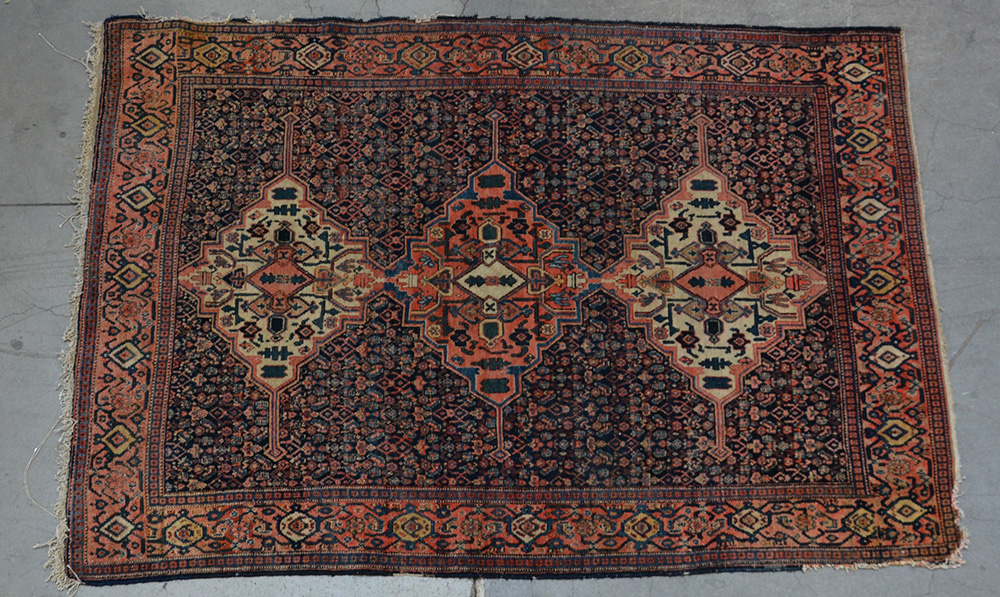 Tappeto Sennèh, Persia fine sec. XIX. Disegno con tre medaglioni su fondo blu decorato con motivo Herati (cm 189x133) (difetti e mancanze)