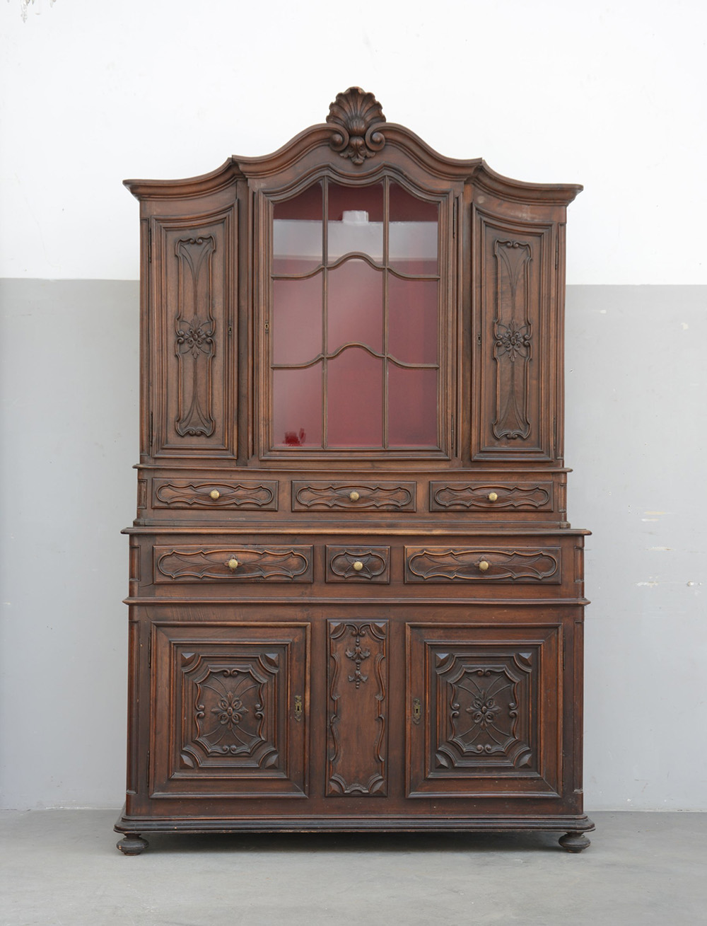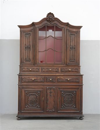 Mobile a due corpi in stile piemontese con parte superiore a tre ante a vetri...