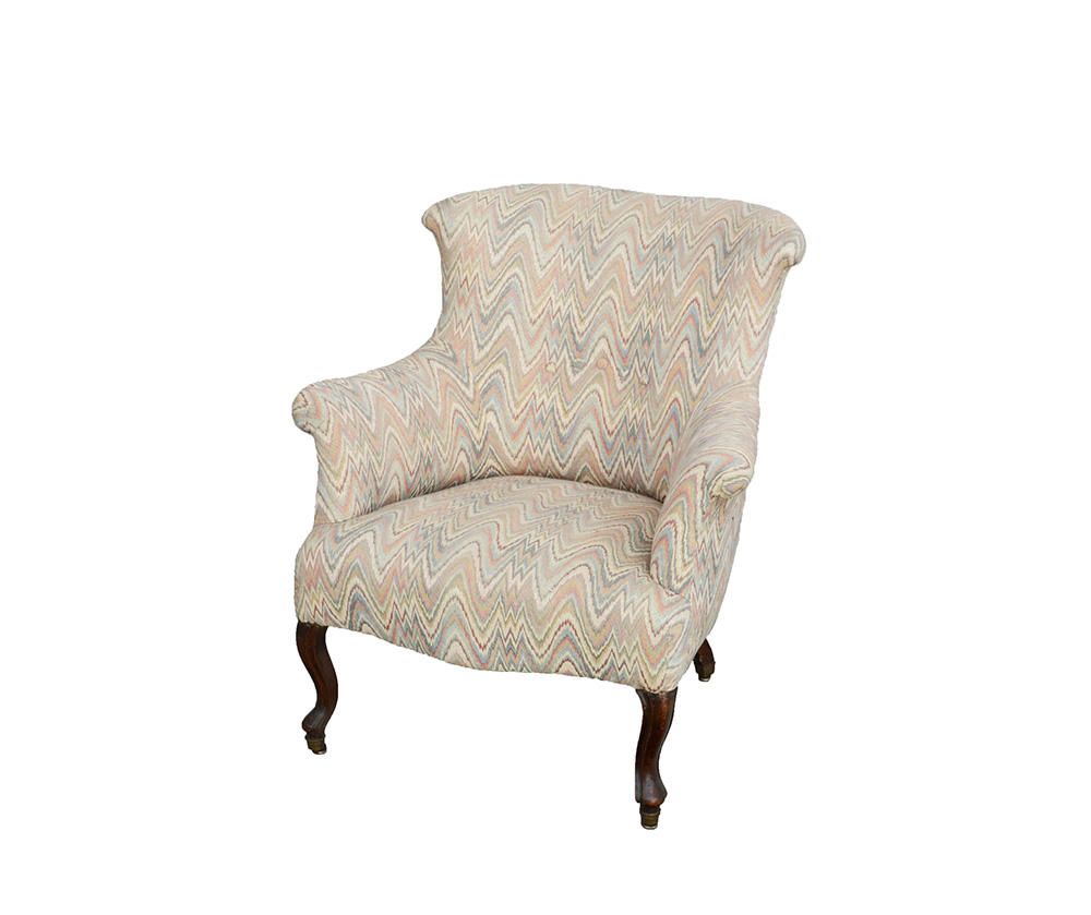 Poltroncina a pozzetto con piedi mossi, rivestita con tessuto a fiamma, secolo XIX (difetti)