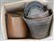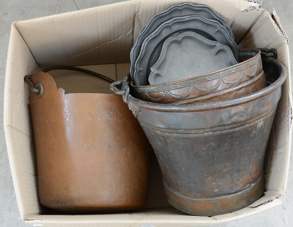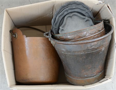 Cartone contenente quattro secchi ed un sottovaso in rame ed alcuni oggetti in peltro