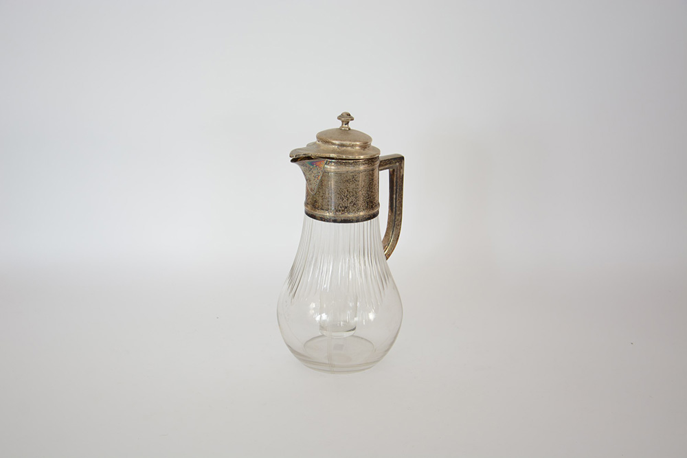 Brocca in vetro con ghiera in metallo argentato. Austria 1920 ca. (difetti)