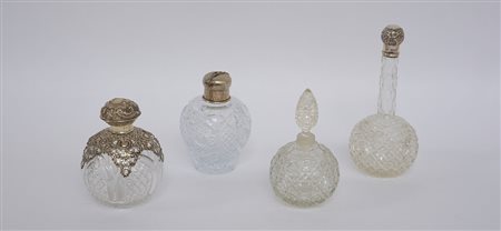 Lotto di quattro bottigliette porta profumi in cristallo molato di cui tre con tappi in argento (h max cm 20,5) (lievi difetti)
