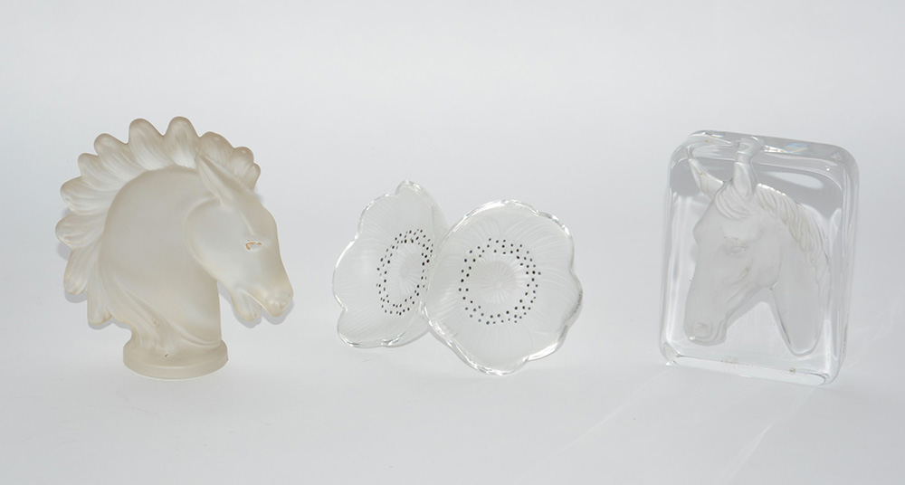 Lotto composto da un presse-papier con testa di cavallo in cristallo firmato Daum, il tappo di una bottiglia per profumo firmato Lalique, e una scultura a testa di cavallo in cristallo acidato di manifattura francese (lievi difetti)