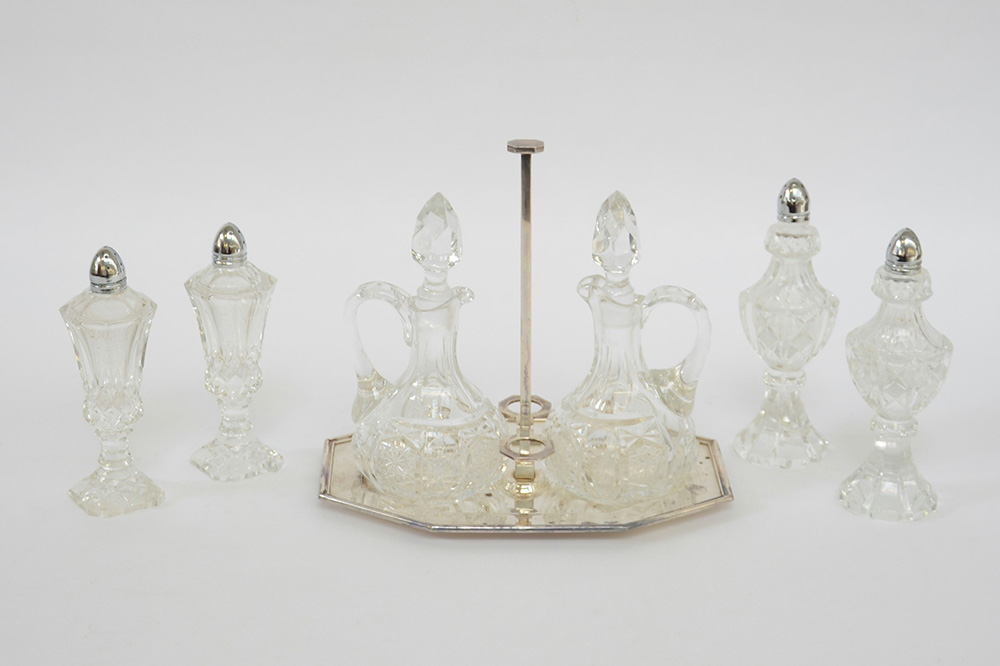 Lotto composto da due coppie di saliere e pepiere in cristallo molato e un cruet-stand in argento sterling marcato Faraone (gr 430) con ampolle in cristallo (difetti)