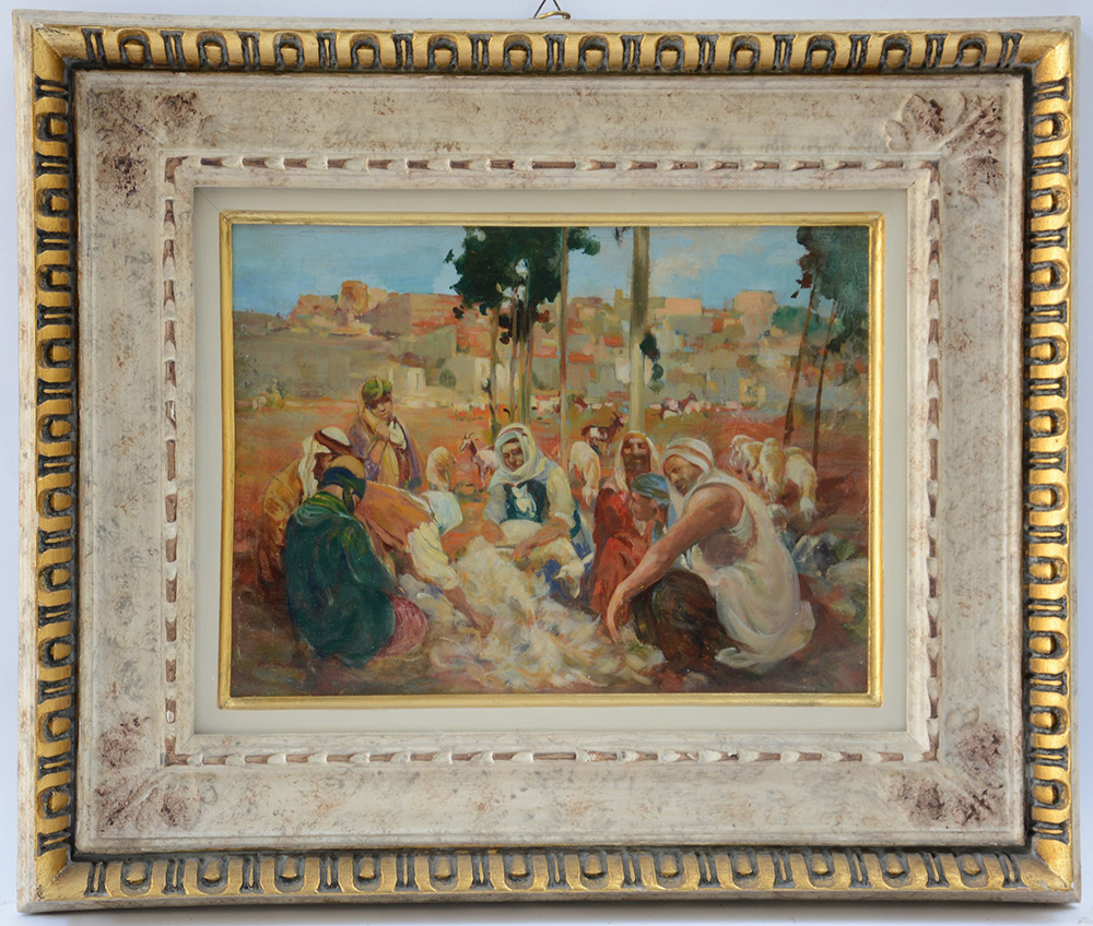 Attilio Achille Bozzato Chioggia 1886-Cremona 1954 "Tosatura delle pecore alle porte di Gerusalemme", olio su tela applicata su pannello (cm 29x40) firmato in basso a sinistra; etichetta con titolo al verso, in cornice