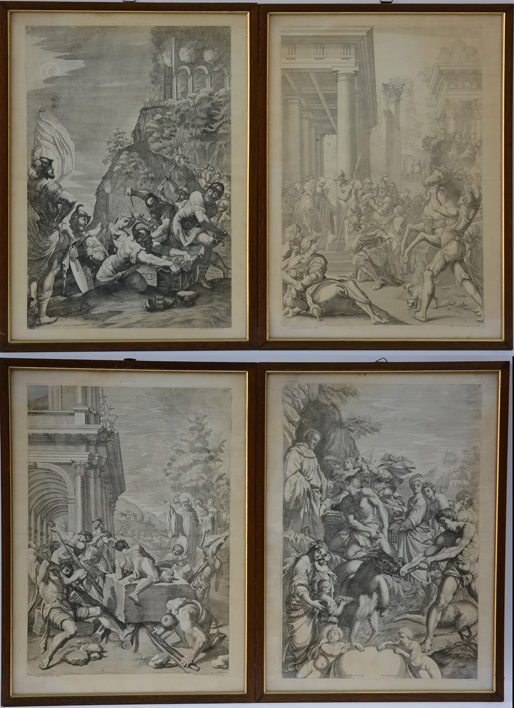 Gruppo di 4 acqueforti del secolo XVIII da Carracci e Guido Reni (cm 60x42) in cornici (difetti)