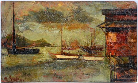 Scuola inizio sec XX "Scorcio di porto" Olio su tavoletta (cm 16x26) firmato A. Lupo in basso a sinistra