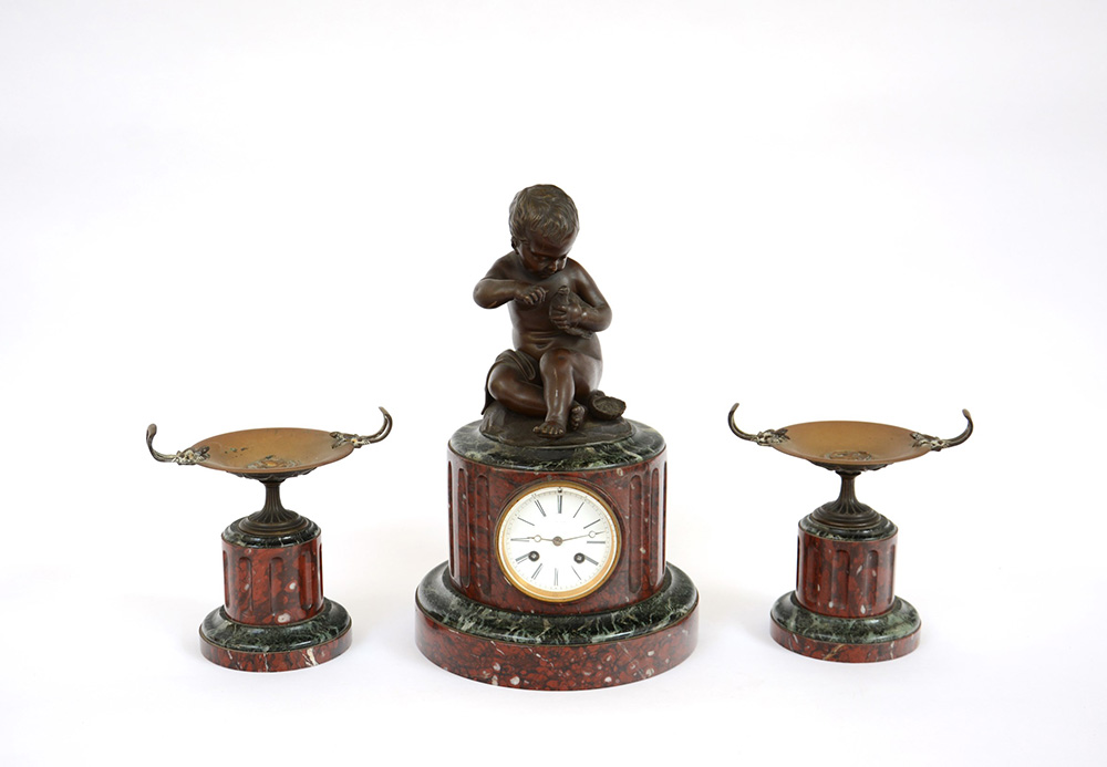 CH. PICKARD Trittico da camino composto da pendola sormontato da putto e due basi in marmo rosso Epoca fine sec. XIX Movimento a carica settimanale, suonerie ore mezze, scappamento ad ancora, sospensione brocot Quadrante a smalto bianco, cifre romane (h. cm 40)