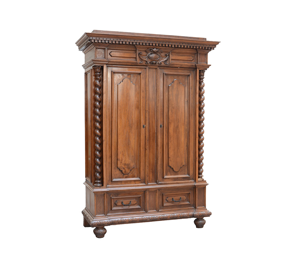 Armadio di forma architettonica a due ante e due cassetti nella fascia con montanti a torciglioni (cm 160x239x72)