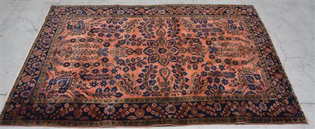 Tappeto Sarouk Persia sec. XIX. Disegno a piccolo medaglione e rami fioriti nei toni del blu, azzurro e beige su su fondo salmone. Bordure a meandro su fondo blu (difetti e mancanze) (cm 195x130)