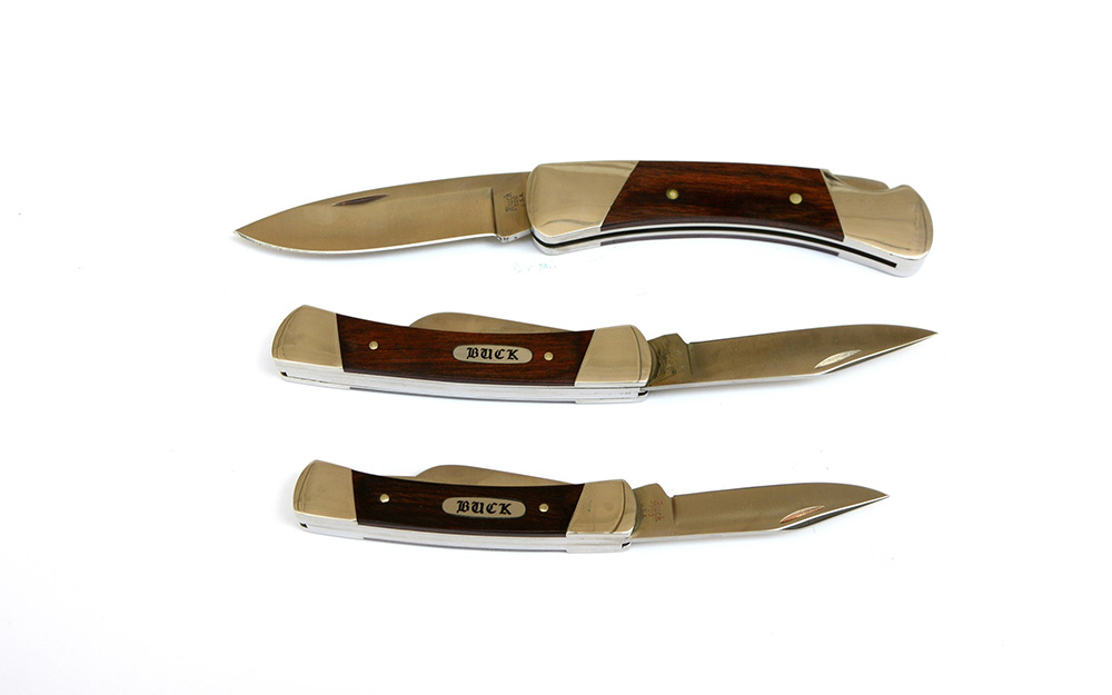 (Historica) Lotto composto da tre coltelli pieghevoli multiuso di cui uno più grande dotato di custodia in cuoio, marca Buck Knives (USA). Tutti in confezione originale.