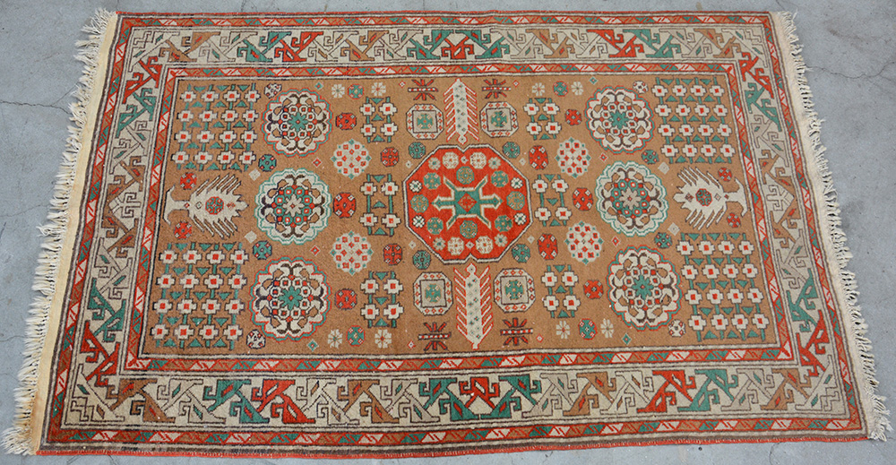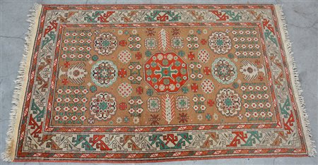 Tappeto Shirwan moderno, Caucaso sec. XX. Disegno con piccolo medaglione ottagonale rosso su campo color cammello decorato con motivi geometrici (cm 128x82)(difetti)