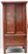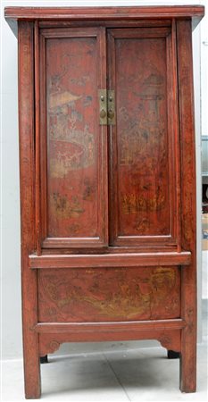 Armadio in legno laccato con fronte a due battenti decorati con scene di vita a rilievi nero e oro su fondo rosso (difetti e restauri) Cina, sec. XX (cm 90x181x57)