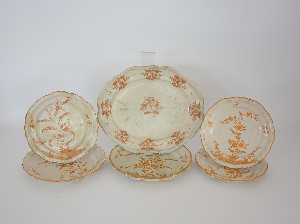 Lotto composto da cinque piatti di misure diverse di fornace lodigiana ed un vassoio ovale ( Liguria) in maiolica con decori a cespi di fiori in giallo ocra. Rotture e restauri. XVIII secolo.