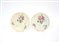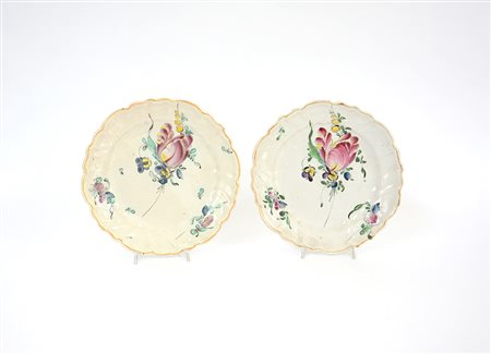 Coppia di piatti tondi polilobati in maiolica policroma a decoro floreale con tulipani e viole. Fine sec. XVIII (lievi difetti)