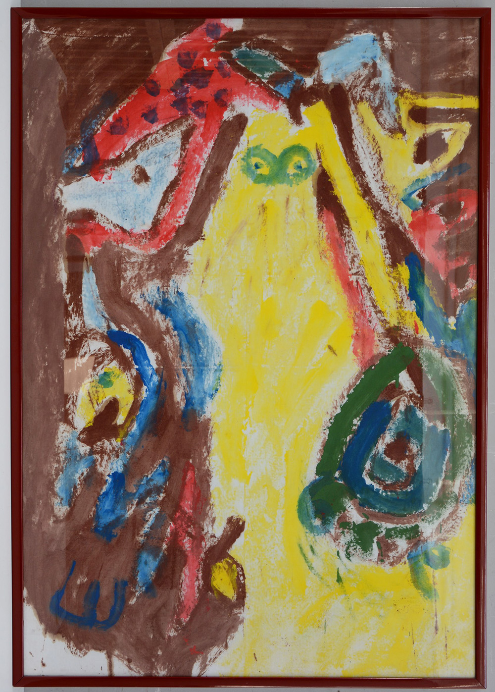Elde Ansgar "Figura gialla" 1986, tecnica mista su tela (cm 125x86) firmato e datato al retro, in cornice (difetti)