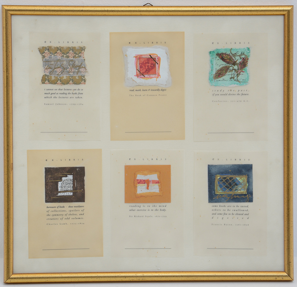 Kimberly Composizione di sei ex libris, 1995 (cm 27x29).Etichette e firma dell'artista al retro. In cornice (lievi difetti)