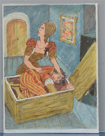 Giuseppe Migneco (Messina 1908-Milano 1997)"Due personaggi" litografia (cm 47,5x35) numerata XXVIII/XXX e firmata in basso a matita. Stampata sul fronte di un quartino ad illustrazione del Decameron di Boccaccio (le quarte 20 novelle) edizione Teodorani, Milano, 1991