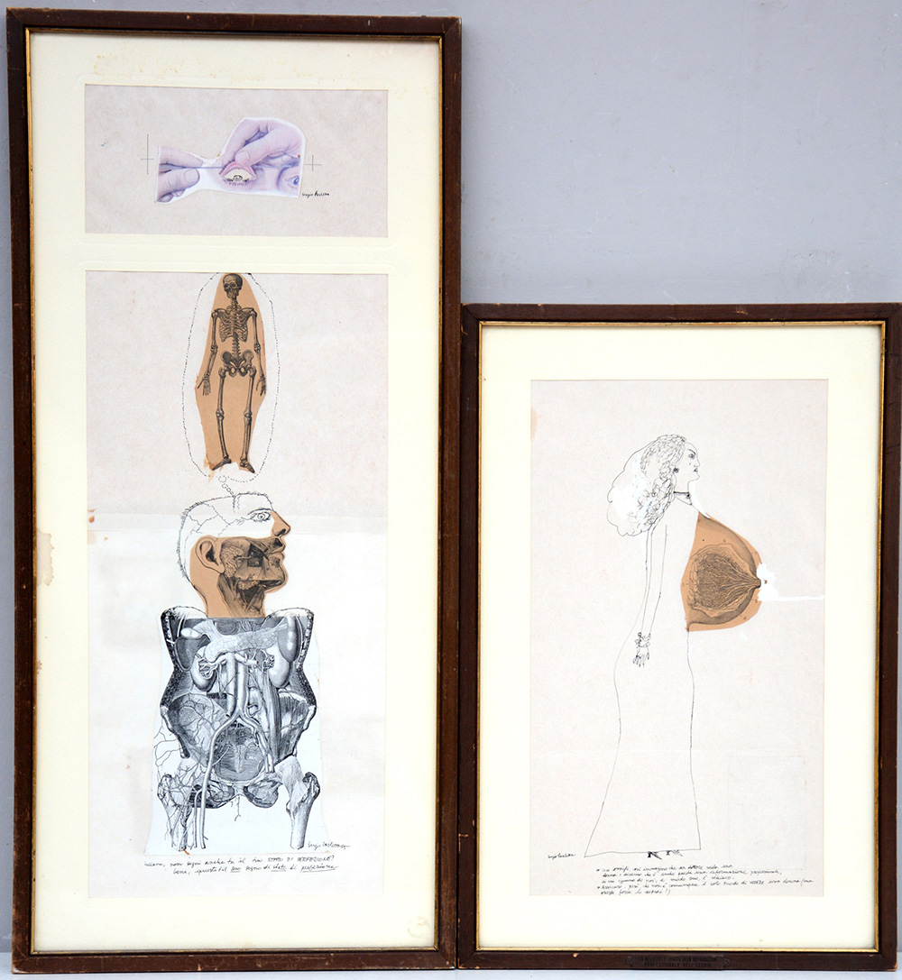 Sergio Barletta Bologna 1934 Due illustrazioni a tecnica mista e collage probabilmente per la rivista "Humor Graphic". In cornici (difetti)
