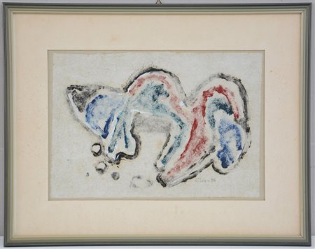 Elde Ansgar "A proposito di vino" 1986, tecnica mista su carta di riso (cm 27x39) firmato e datato in basso a sinistra, in cornice (difetti)