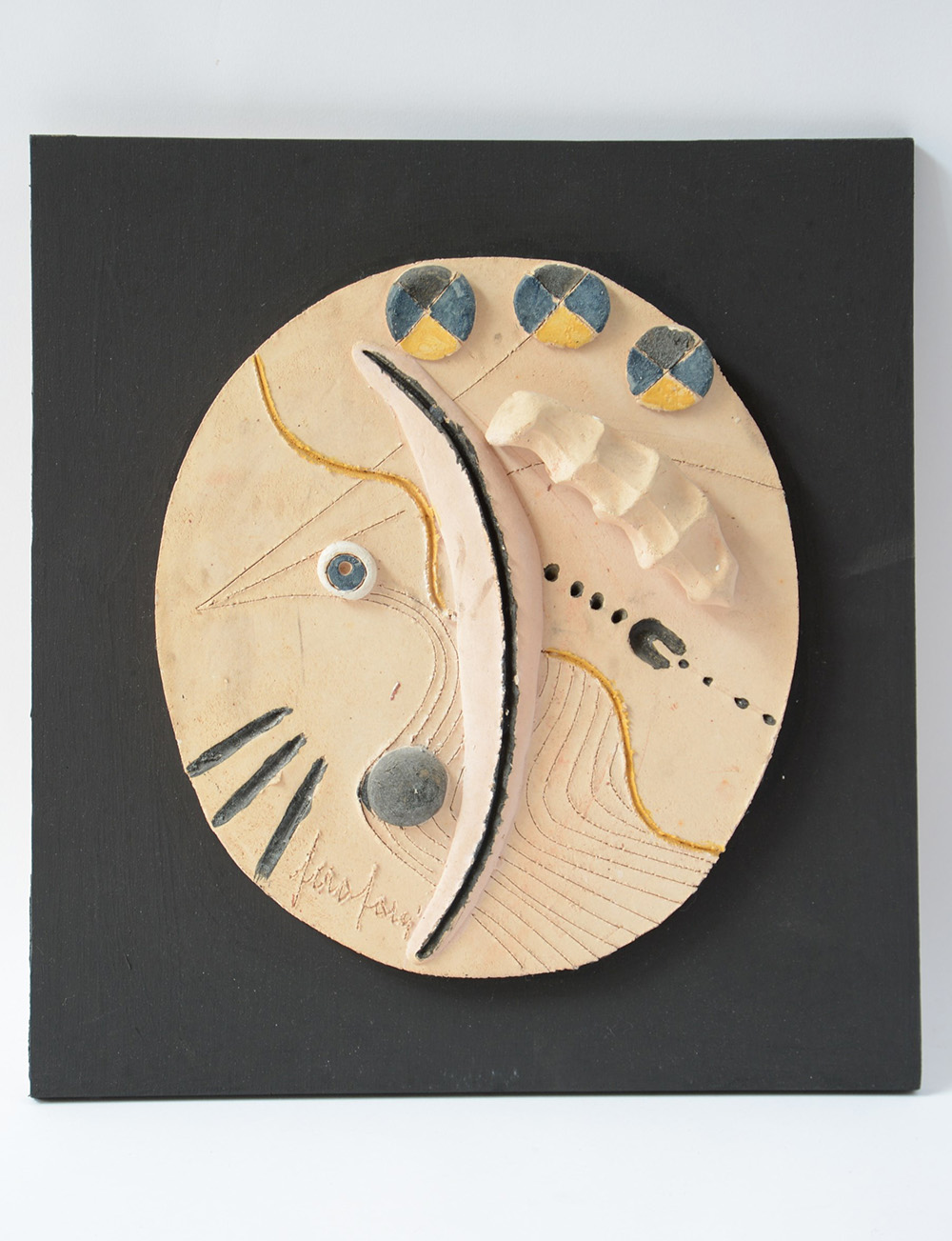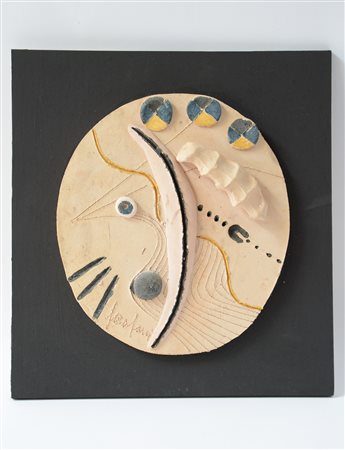 Scrofani Agostino ( 1931- 1995)"Composizione" terracotta tonda decorata in rilievo ed in policromia (diam cm 26) firmata Scrofani, montata su pannello (difetti)