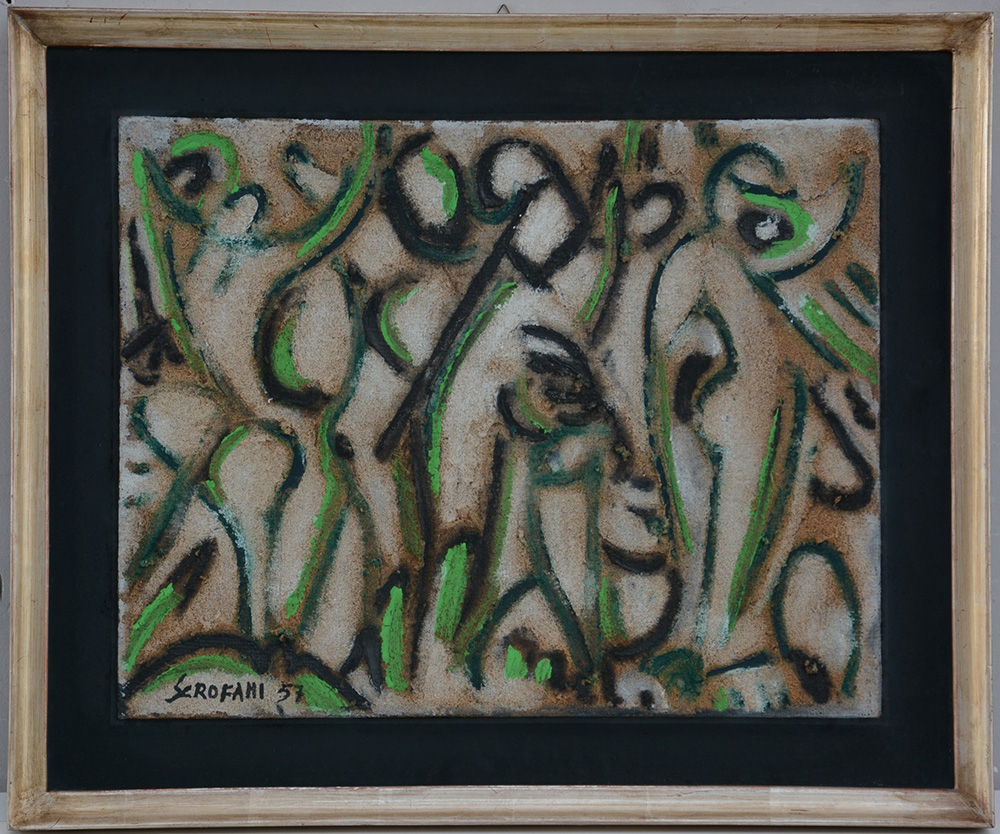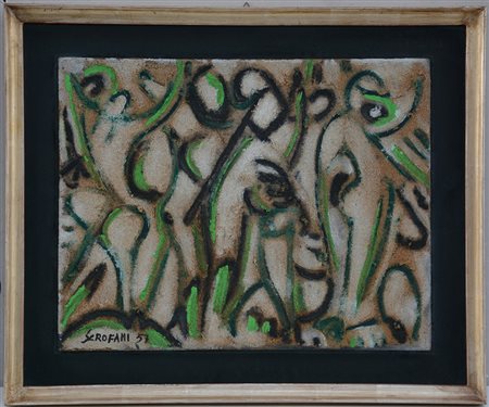Scrofani Agostino ( 1931 1995)"Senza titolo" 1957, tecnica mista su tela (cm 40x50) firmato Scrofani e datato in basso a sinistra e al retro, in cornice (difetti)