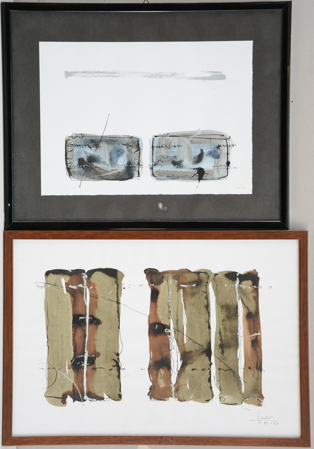 Ignoto "Composizioni" lotto di due tecniche miste, misure diverse, recano firme indecifrate, in cornici (difetti)