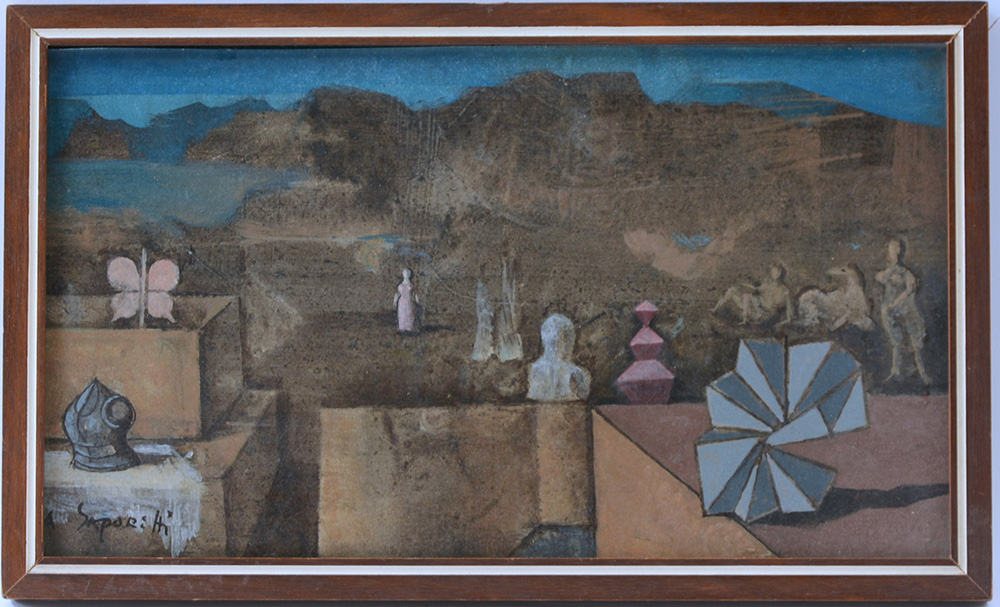 Anne Jenness Saporetti (San Francisco 1914-Florida 1984)"Senza titolo" olio su masonite (19x33 cm) firmato in basso a sinistra. Al retro cartiglio e timbro della mostra ai Frati Camaiore, Lucca. In cornice