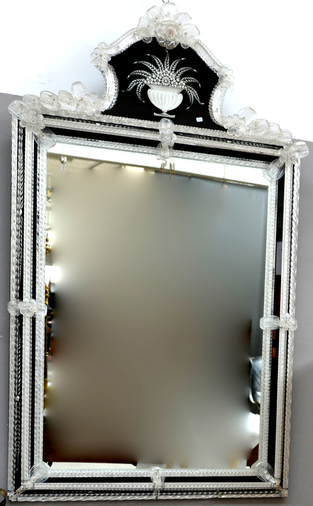 Specchiera in vetro di Murano decorata a motivi floreali, con cimasa incisa a vaso di fiori (cm 131x78) (difetti e mancanze)