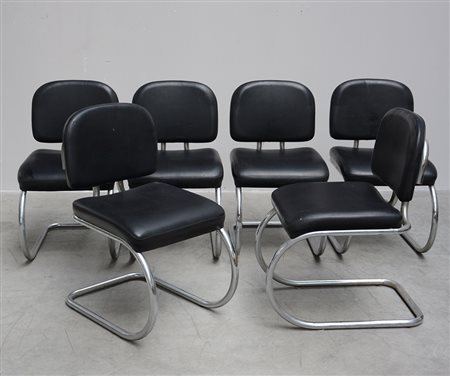 Sei poltroncine in tubolare metallico cromato, con seduta e schienale imbottito rivestito in skai nero. Italia, anni 70 (difetti)