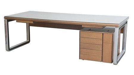 Centro Progetti Tecno, Varedo, anni 70 Lotto composto da una scrivania modello "T 333" in alluminio pressofuso e legno massello impiallacciato e bordato con piano in cristallo, unita a una cassettiera impiallacciata in legno con piano in cristallo (cm 221x70x100) (difetti)