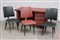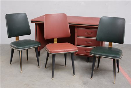 Lotto composto da una scrivania a tre cassetti rivestita in similpelle rossa, unita a tre sedie di analoga fattura, una rossa e due verdi. Manifattura Mascagni, Bologna, anni 70 (cm 138x74x74) (lievi difetti)