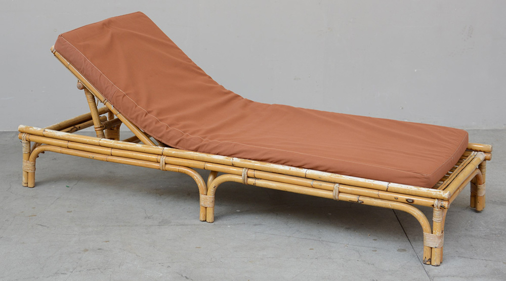 Sdraio modello "Villa d'Este" con struttura in bambù e testiera regolabile, completa di materassino. Esecuzione Vittorio Bonacina, Lurago d'Erba, 1981 (difetti) Provenienza: Villa Maggio, Garda