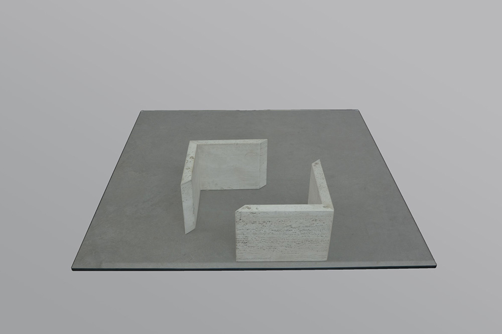 Tavolo da salotto con piano in cristallo e due basi in travertino. Italia, anni 70 (110x16x110)