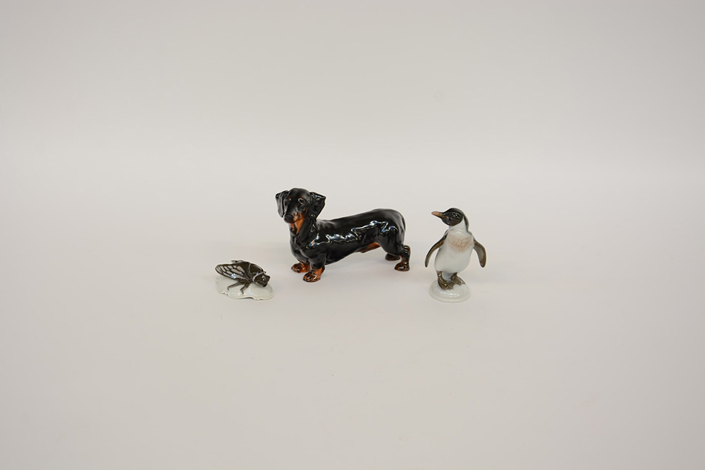 Manifattura Royal Doulton e Rosenthal, lotto di tre sculturine in porcellana policroma raffiguranti bassotto, pinguino e mosca. Secolo XX (misure diverse) (difetti)