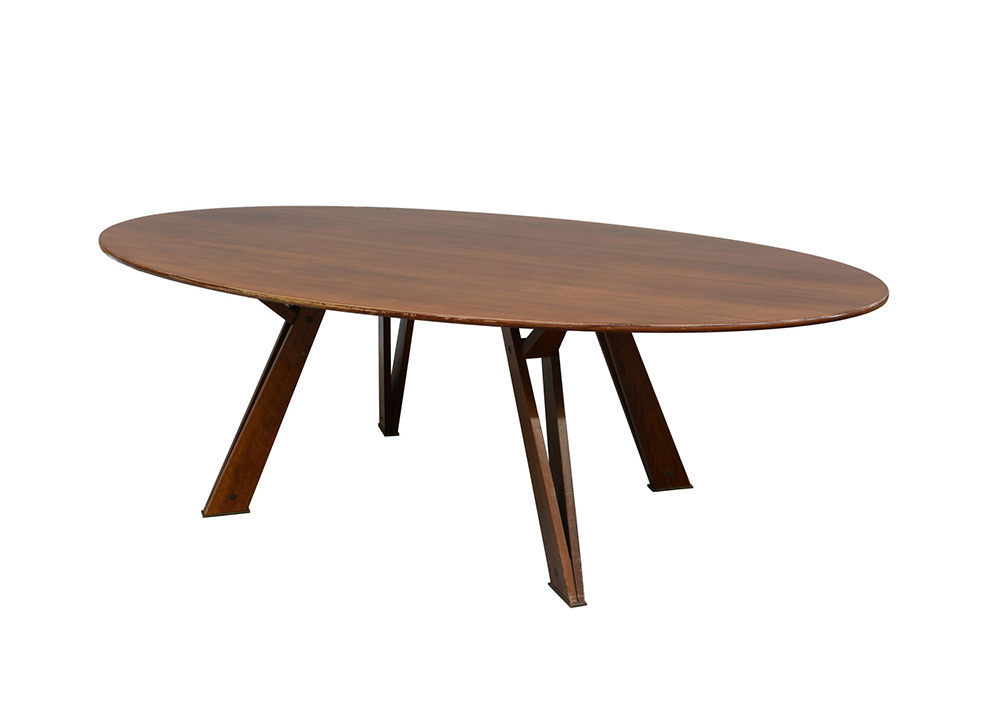 Grande tavolo in legno massello e impiallacciato con piano ovale e struttura...