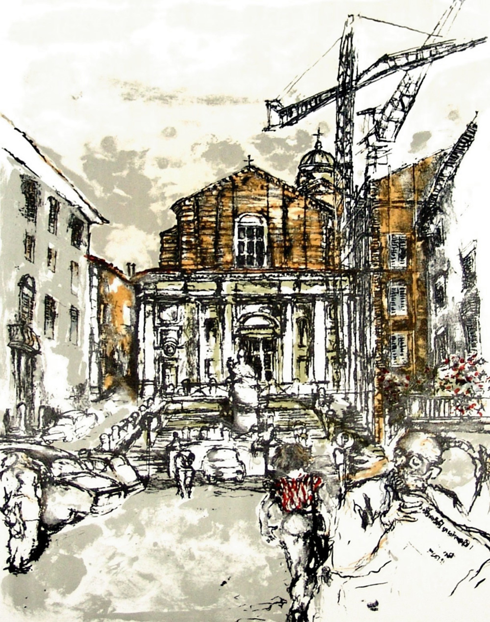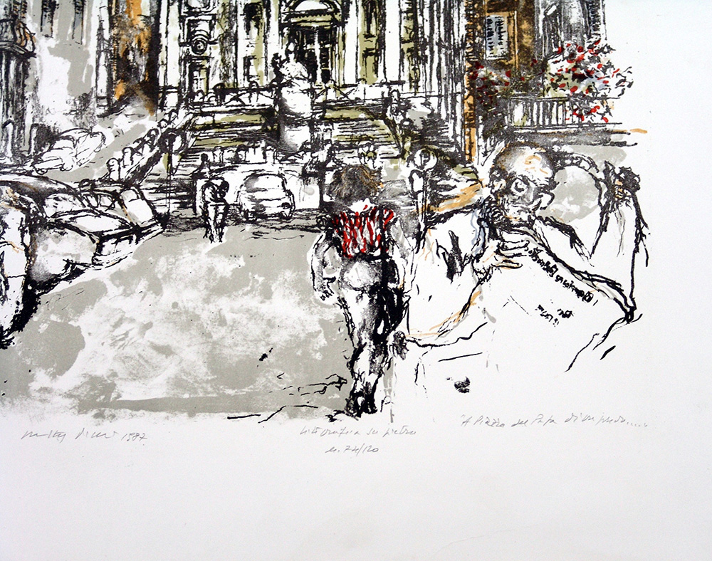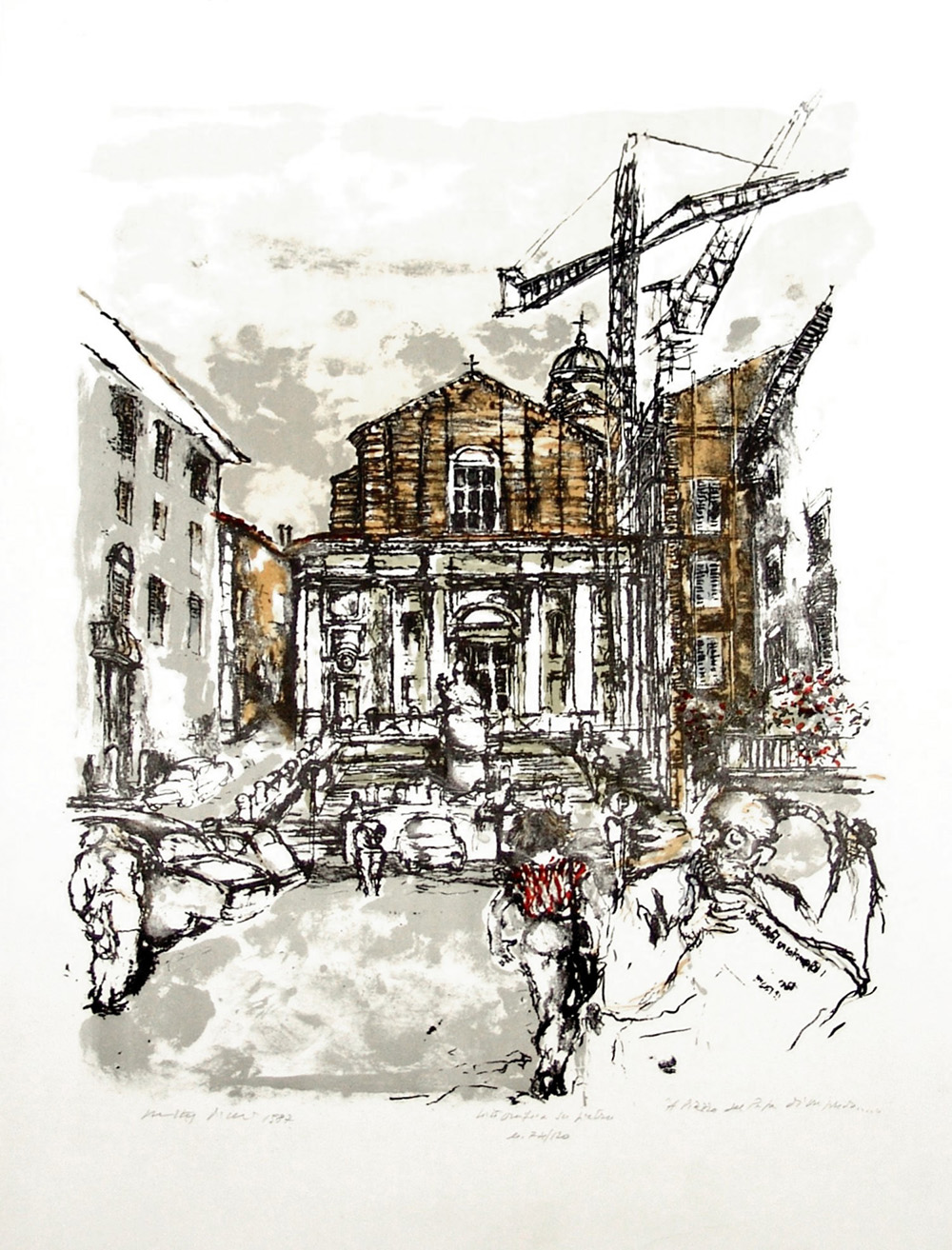 Walter Piacesi 1929, Ascoli Piceno (Ap) - [Italia] A Piazza del Papa litografia 70x50 cm 1987 es. 74/120; firma dell’artista in basso a sinistra certificato di autenticità Picenum