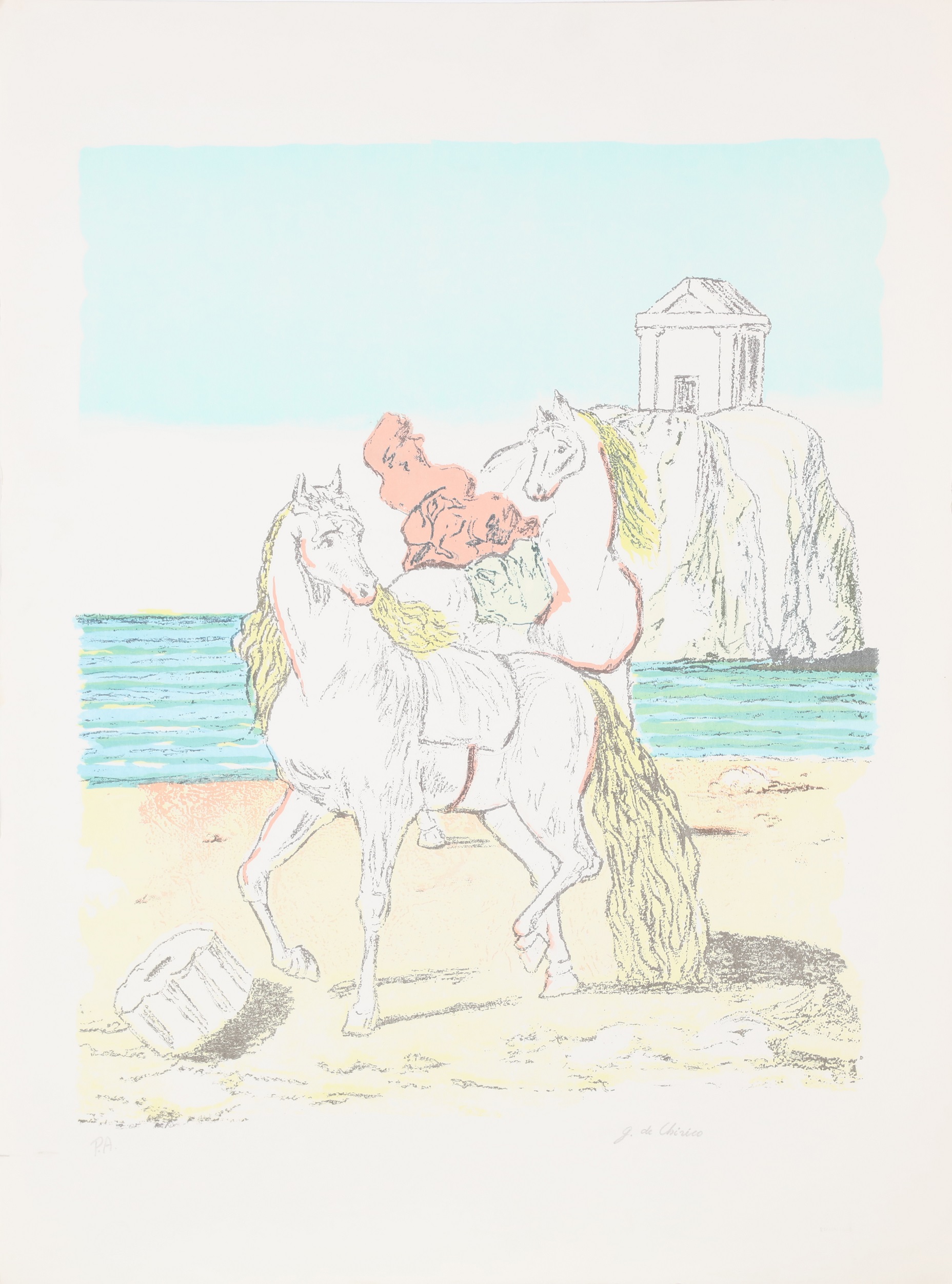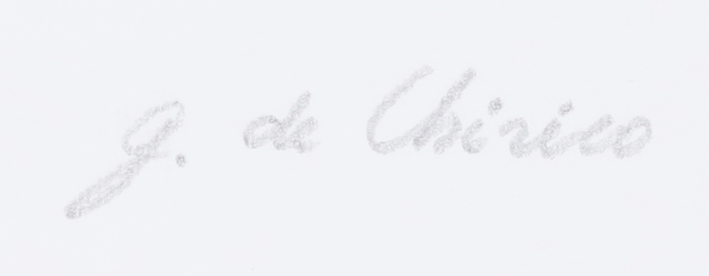 DE CHIRICO GIORGIO (1888 - 1978) Senza titolo. Litografia. Cm 56,00 x 75,00. P.a. Tiratura e firma a matita in basso. Timbro a secco Giorgio De Chirico in basso a sinistra. Timbro a secco Alberto Caprini Stampatore, Roma in basso a destra.
