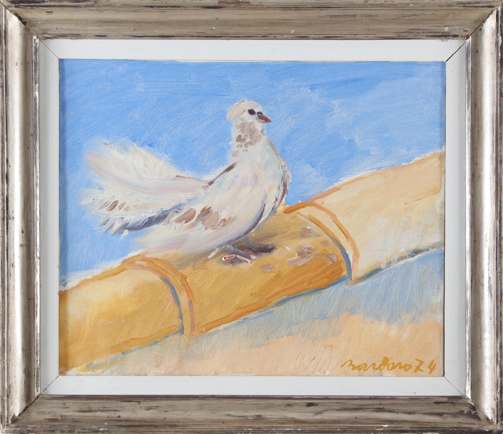 BARBARO SAVERIO (n. 1924) La colomba. 1974. Olio su tela . Cm 60,00 x 50,00. Firma e anno in basso a destra. Al retro titolo, firma e anno. Timbro Maison Franco, Nizza. . Cornice presente